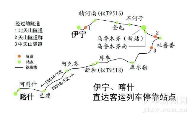10月20日早晨9时,T9516/7次列车缓缓驶出伊宁火车站,在第二日早晨8时59分到达喀什,全程不到24小时。这是历史上第一趟从伊宁出发,直通南疆喀什的客运列车。列车途经伊犁、博尔塔拉蒙古自治州、石河子、乌鲁木齐、吐鲁番、巴音郭楞蒙古自治州、阿克苏、克孜勒苏柯尔克孜自治州、喀什等地,经停车站11个,全程2079公里,相当于中国疆域东西宽的五分之二。得益于今年的第八次疆内旅客列车运行图调整,这趟列车结束了两地之间无直达旅客列车的历史,并第一次实现客运列车在24小时内三次跨越天山,拉近了北疆伊犁和南疆各地之间的距离。
