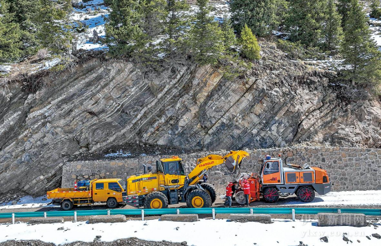 4月21日,在伊昭公路白石峰段,伊犁公路事业发展中心察布查尔养护所工作人员正组织大型清雪机和铲车清除路面上厚厚的积雪,确保伊昭公路能按期恢复通车。