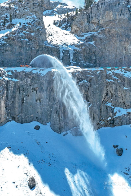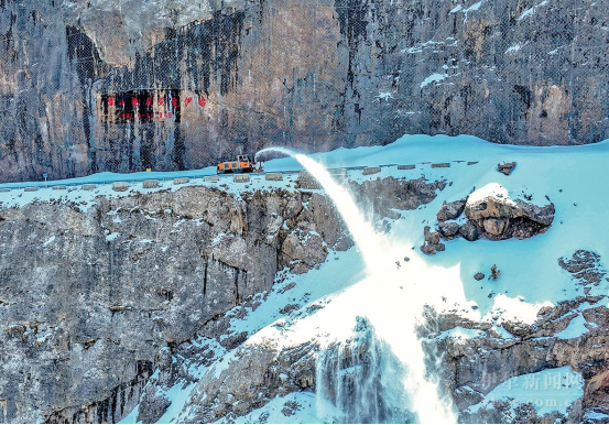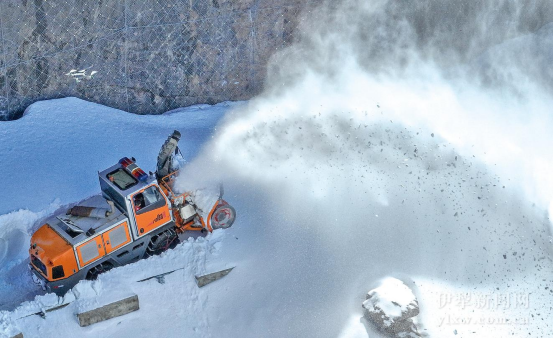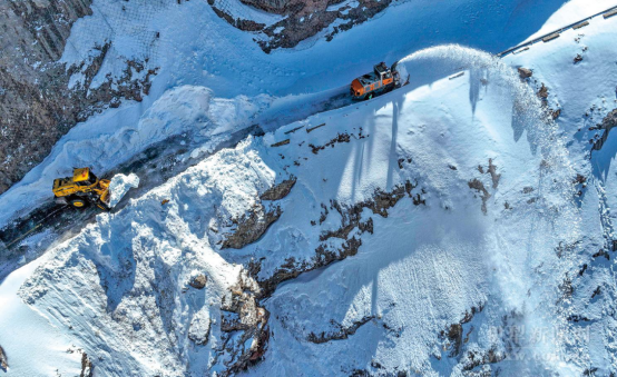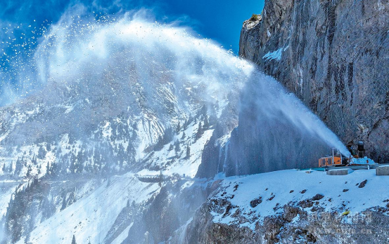 扫雪车将积雪抛撒到悬崖峭壁下