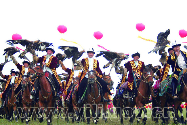 草原上的哈萨克人,既是畜牧业的行家,也是捕猎 能手。他们传统的捕猎武器,除猎狗外,主要是猎鹰。 每当冬季出猎,剽悍的哈萨克猎手,身跨天山骏马,手托凶猛的猎鹰,在猎犬的前呼后拥下,放马奔驰于山林 草原上,每次行猎,必会有所收获。而所得之物,不论 是黄羊、狐狸,还是野鸡、野兔,都要归功于灵巧勇猛 的猎鹰。