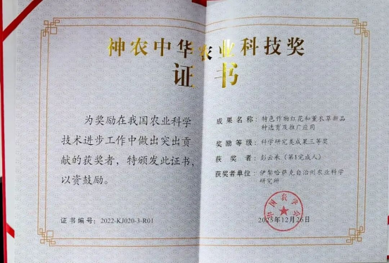 近日,中国农学会正式公布了2022—2023年度神农中华农业科技奖获奖名单,伊犁哈萨克自治州农业科学研究所完成的“特色作物红花和薰衣草新品种选育及推广应用”成果荣获科学研究类成果三等奖。