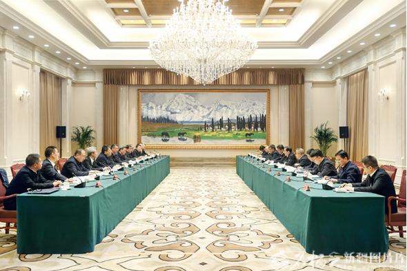 12月4日,自治区党委书记陈小江、自治区主席艾尔肯·吐尼亚孜在乌鲁木齐会见中国中铁股份有限公司董事长陈文健一行。石榴云/新疆日报记者谢龙摄