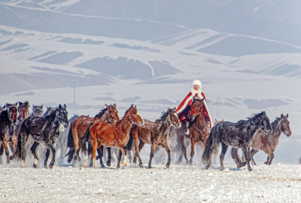 2020年12月31日,贺娇龙在昭苏县天马旅游文化园策马雪原,为家乡宣传。李文武摄