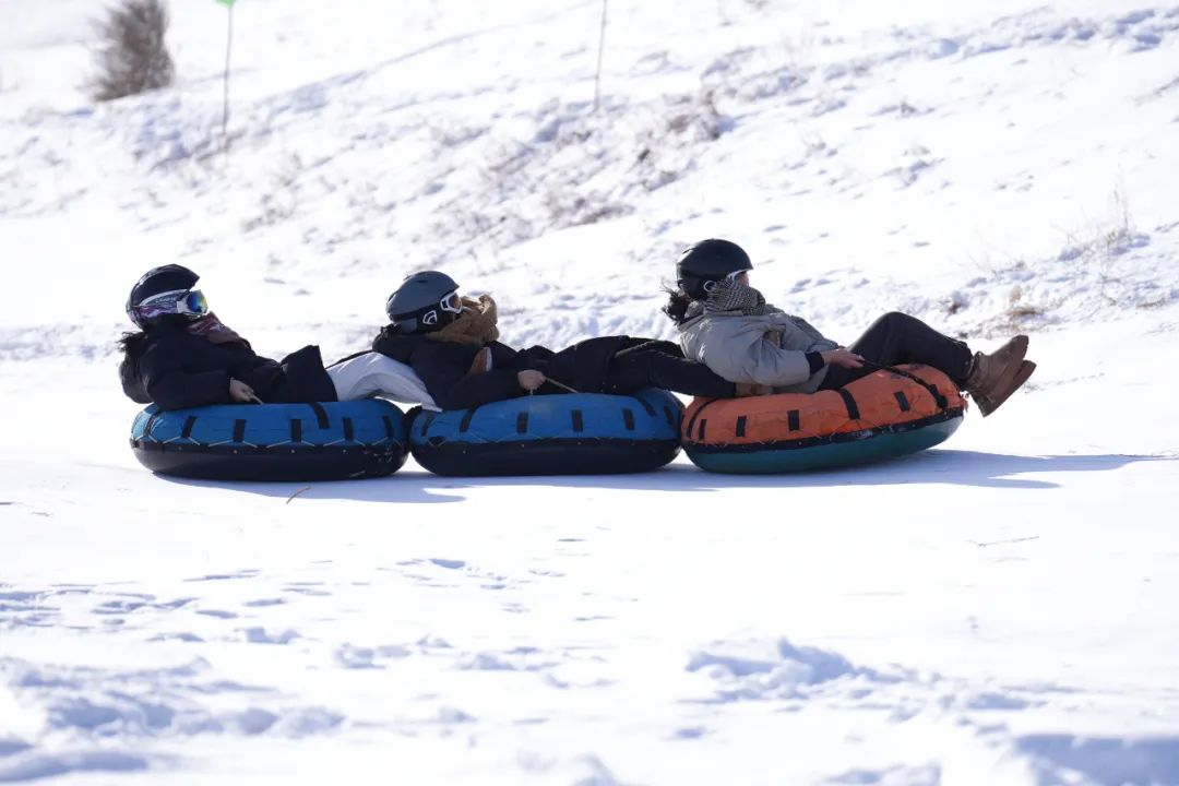 伊宁市快乐星滑雪场,游客坐雪圈滑雪。刘春星摄