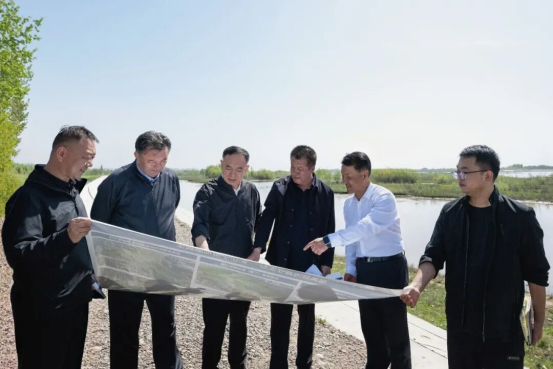 在伊犁河湿地水生态修复建设工程现场,州党委书记杨秀理,州党委副书记、州长叶尔夏提·吐尔逊拜细致听取美丽河湖保护与建设项目情况汇报。孙艺男摄