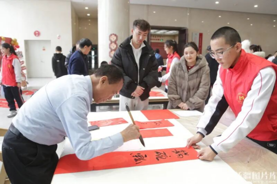 范星民是当天现场最忙碌的身影之一。面对各族群众的质朴心声,他铺纸、蘸墨、挥毫,动作行云流水,墨香萦绕间,一副副贴合群众心意的春联跃然红纸。“今年,不少老百姓都拿着‘藏’有新年愿望的春联让我们来写,这些心愿特别质朴,写这样的春联,多少我都不觉得累。”范星民笑着说。