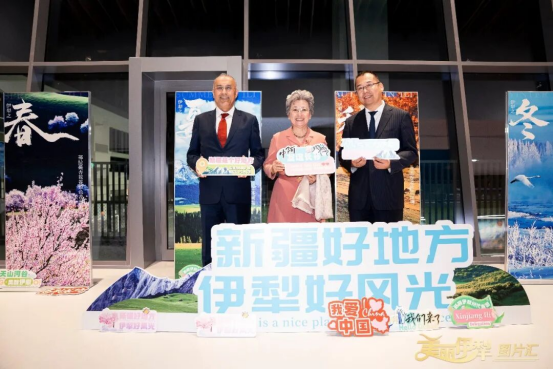 中国驻迪拜总领馆领事欧渤芊与伊犁州代表在伊犁春夏秋冬宣传图片前打卡。