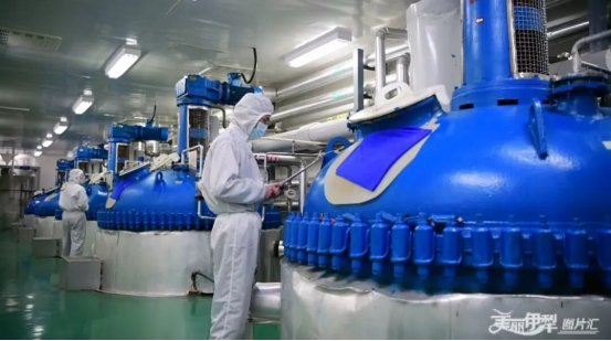 在伊犁川宁生物技术股份有限公司头孢提取车间,工作人员使用结晶反应釜进行结晶作业。