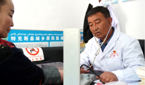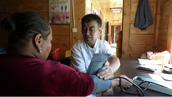 天微微亮,居马泰佩戴好党员徽章,开启他一天的牧区巡诊。从卫生院开车出发,在崎岖的山路上缓慢行驶30多分钟后,居马泰来到特克斯县乔拉克铁热克镇塔斯巴斯陶村牧民哈尼·达布尔的家,为他做检查并送来治疗高血压的药物。