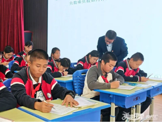 随后,南京援疆教师、倪建初中数学教学能手培养工作室主持人倪建带来七年级《有理数乘法》示范课。倪建精准把握知识结构,注重引导学生自主回顾与梳理,实现从“点”到“面”的认知飞跃。他凭借深厚的专业素养,将复杂知识讲解得深入浅出,有效激发了学生的学习兴趣,展现了初中课堂对小学知识的承接与发展。