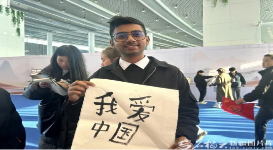 在书法展示区,青年们纷纷拿起毛笔,在朱红暗纹宣纸上用中文写下自己的名字,看着手中的作品,大家脸上露出了开心的笑容。来自孟加拉国的梅拉杰是新疆大学留学生,他写下了“我爱中国”四个字:“在中国留学期间,我感受到了这里的人们热情淳朴,我深深爱上了这个国家。”