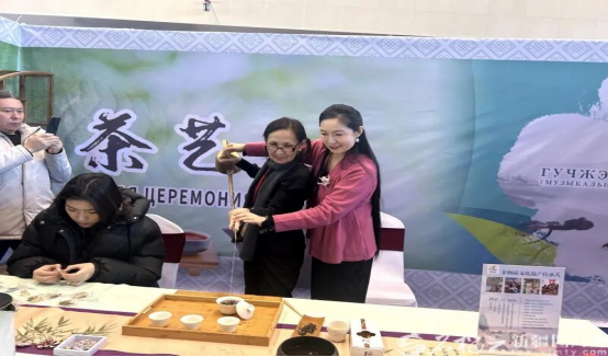 哈萨克斯坦学者在茶艺师的指导下,学习长嘴茶壶茶艺表演。