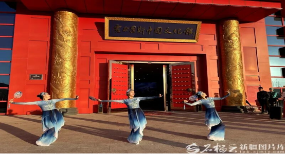 舞蹈演员在霍尔果斯中国文化馆门前翩翩起舞。