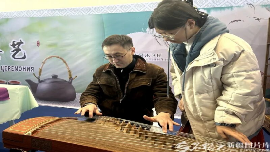 哈萨克斯坦青年学习弹奏古筝。