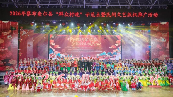 2月4日,察布查尔锡伯自治县举办“中国箭乡聚欢歌·乡韵村晚暖民心”2026年“群众村晚”示范点暨民间文艺版权推广活动。活动以铸牢中华民族共同体意识为主线,涵盖非物质文化遗产演绎、民俗表演、戏曲联唱、器乐合奏、情景剧、中华经典诵读等各类节目,现场设置非物质文化遗产展示和民间文艺版权推广区,包含书法、剪纸、拓印、珠绣、锡伯族刺绣等10个展位,是察布查尔县深入推进文化润疆的生动实践。
