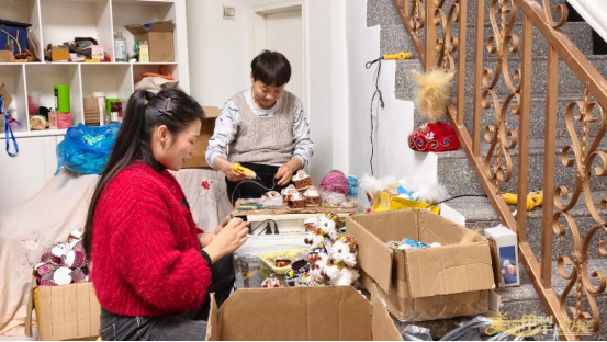 在杨洋家中,妻子张婉君和母亲正在加班赶制“小羊”,“小羊”戴着小花帽,显得憨态可掬。张婉君介绍:“我现在做的这个叫‘戴着小花帽的小羊’。因为全是手工制作,进度比较慢,我们现在就得开始为夏季旅游高峰期备货了。”