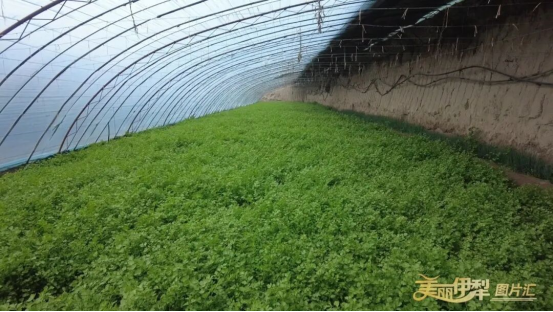 在达达木图镇旺达蔬菜基地,更是绿意盎然。农户们种植的黄瓜已经抽条,芹菜、茼蒿、韭菜绿油油的一片,长势喜人,有的已经开始收割上市。