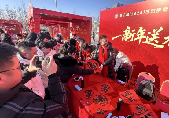 文化体验区同样热闹非凡:江苏和伊犁两地书法家挥毫泼墨,现场书写的春联赠送给往来游客;电商直播间里,主播正热情推介来自苏伊两地的特色产品;就业招聘展台前,一群放假回乡的大学生排队咨询工作岗位;而在伊犁河灯展区,已经有不少游客和市民在排队拍照打卡。值得一提的是,特色年货生活节开幕式上还特别设置了新春送福环节,主办方从2025年苏伊两地青少年“苏韵伊情·笔墨凝香”迎新春写春联送祝福活动的获奖作品中,精心挑选了20副优秀春联,赠予伊犁州“最美家庭”代表。据悉,“苏韵伊情·笔墨凝香”写春联活动得到两地青少年热烈响应,累计征集作品2958副,经专家评审与线上大众投票,最终评选出130副获奖作品。此次赠予“最美家庭”的春联便是其中的佼佼者,旨在以笔墨传情,给伊犁各族群众送去新春祝福,进一步传承发扬中华优秀传统文化,营造欢乐祥和中国年的浓厚氛围。