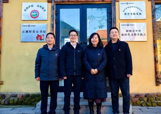 在伊宁市克伯克于孜乡阿热买里村,骆治纬(左二)募集公益资金110万元、价值20多万元公益物资,建起“石榴籽爱心书屋”。图片由受访者提供