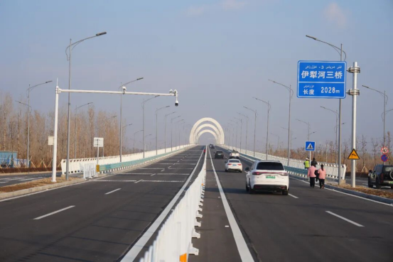 伊犁河三桥由中铁三局承建,坐落于伊宁市、可克达拉市与察布查尔锡伯自治县交会处,桥长2028米,桥宽23.5米,采用双向四车道一级公路兼城市主干道标准,设计时速60公里。大桥北起霍尔果斯经济开发区伊宁园区,南抵察布查尔伊犁河国家湿地公园北侧,彻底打通长期以来制约南北两岸的交通瓶颈,有机衔接多条干线,构建起高效畅通的区域路网,为加强新疆与中亚地区互联互通、服务国家战略注入新动力。
