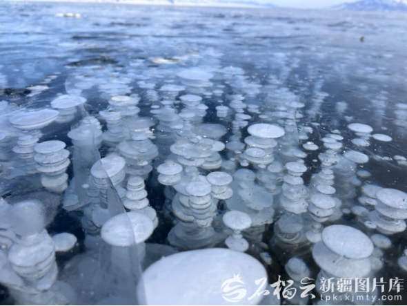新疆的冬日,是雪与湖的浪漫邂逅。往日里碧波荡漾的赛里木湖湖面,冬日化作厚达数米的蓝冰,澄澈得能望见水下的砂石。最令人惊叹的是那些镶嵌在冰中的“冰泡”,无数大小不一的气泡层层叠叠,有的如珍珠串连,有的如银河星点,有的聚成朦胧的云团,这冰泡的灵动,为静谧的冬日增添了生命的气息。