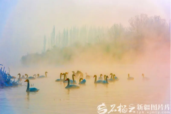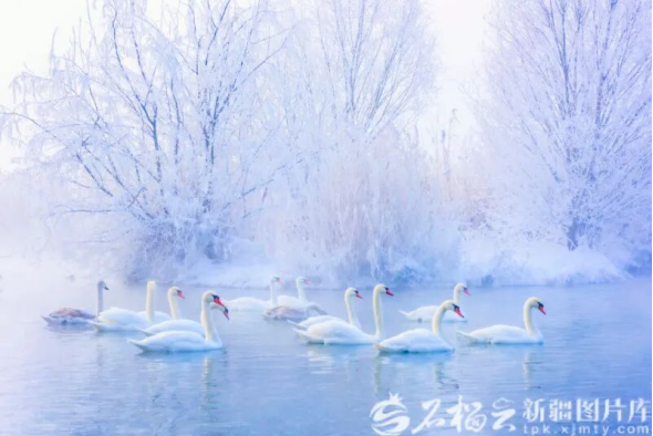 在伊犁的天鹅泉,冬日则是另一番温暖景象。即便气温低至零下二三十摄氏度,这里的湖水却始终不冻,雾气氤氲如仙境。每年冬季,成群的疣鼻天鹅会如期而至,它们洁白的羽毛在雾气中若隐若现,修长的脖颈优雅地弯曲,时而在水中嬉戏,激起层层涟漪,时而展翅盘旋,掠过水面的瞬间,十分灵动可爱。