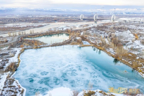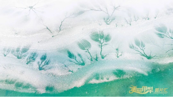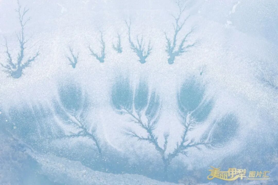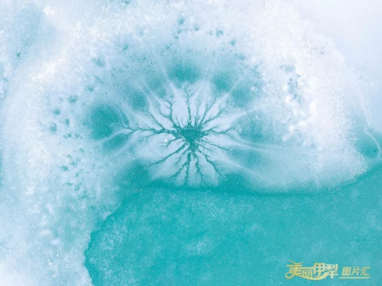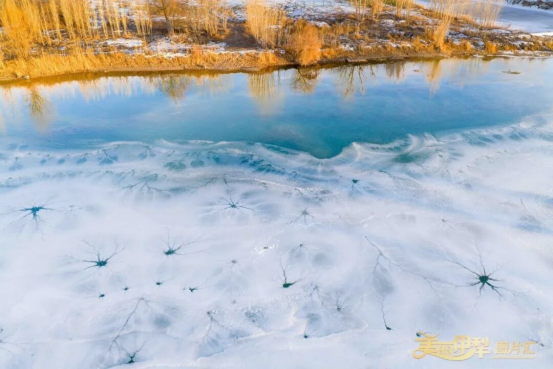 近日,位于察布查尔锡伯自治县绰霍尔镇的伊犁河国家湿地公园内一片片湿地水系覆上坚硬光滑的冰壳,变成冰与雪的舞台。当气温、风速、风向、降雪和地貌等各项要素都“配合”得恰到好处的时候,湖水从冰面裂纹中涌出,在薄薄的积雪上渲染、扩展,勾勒出一片片巨大的冰湖之星图案。