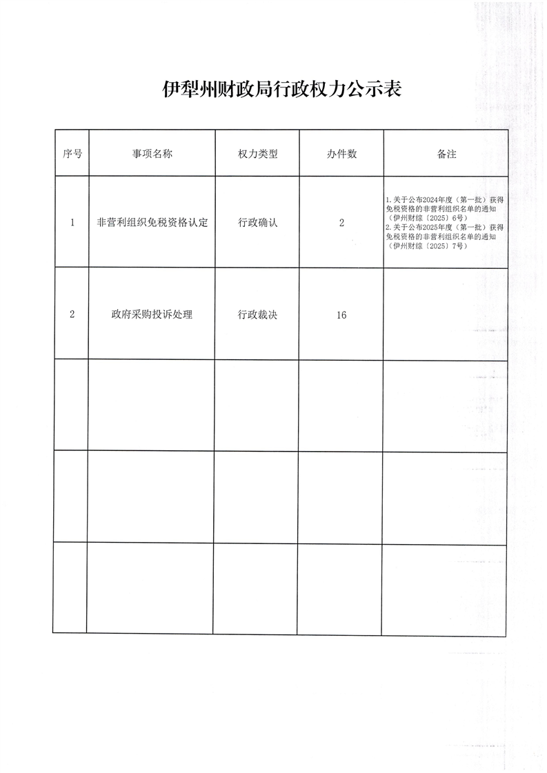 伊犁州财政局2025年其他对外管理服务权力事项办理情况表