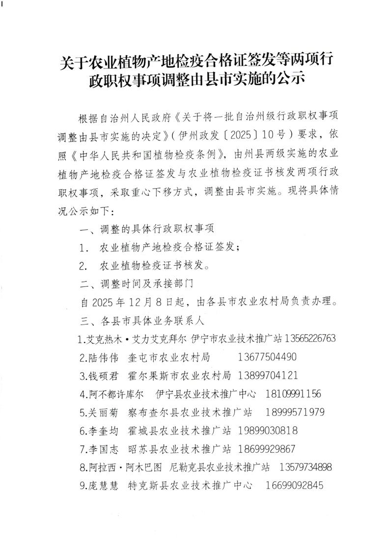 关于农业植物产地检疫合格证签发等两项行政职权事项调整由县市实施的公示