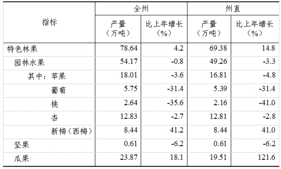州直全年特色林果产量69.38万吨,比上年增产14.8%。其中,园林水果产量49.26万吨,减产3.3%;坚果产量0.61万吨,减产6.2%;瓜果产量19.51万吨,增产121.6%。(见表1)