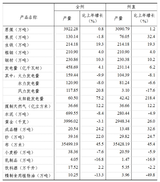 州直在统计的72种主要规模以上工业产品中,33种产品产量实现增长,增长面为45.8%。规模以上工业原煤产量3090.79万吨,比上年增长1.2%;发电量231.14亿千瓦时,增长6.2%。(见表2)