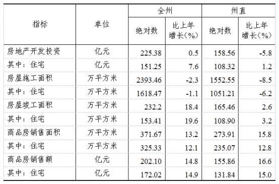 全州全年房地产开发投资225.38亿元,比上年增长0.5%。其中,住宅投资151.25亿元,增长7.6%;办公楼投资3.76亿元,下降8.6%;商业营业用房投资53.19亿元,下降10.5%。全年商品房销售面积371.67万平方米,比上年增长13.2%。