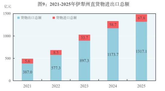 州直全年货物进出口总额1384.98亿元,比上年增长12.4%。其中,出口1317.14亿元,增长12.2%;进口67.84亿元,增长15.5%。(见图9)