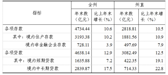 全州年末金融机构(含外资)本外币各项存款余额4734.44亿元,比年初增加452.85亿元。其中人民币各项存款余额4729.14亿元,增加451.10亿元。金融机构(含外资)本外币各项贷款余额4638.14亿元,比年初增加531.47亿元。其中人民币各项贷款余额4638.11亿元,增加531.51亿元。