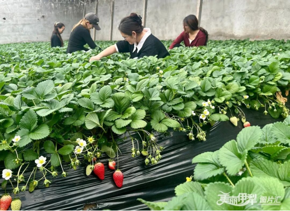 在察布查尔县孙扎齐牛录镇雀尔盘村的草莓大棚内,务工人员和农户们正忙着采摘成熟的草莓。