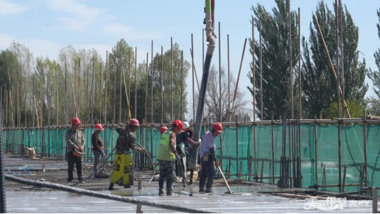 9月2日,工人在伊宁市伊犁手拉手智慧装配产业园车间屋顶浇筑水泥。李亚锋摄