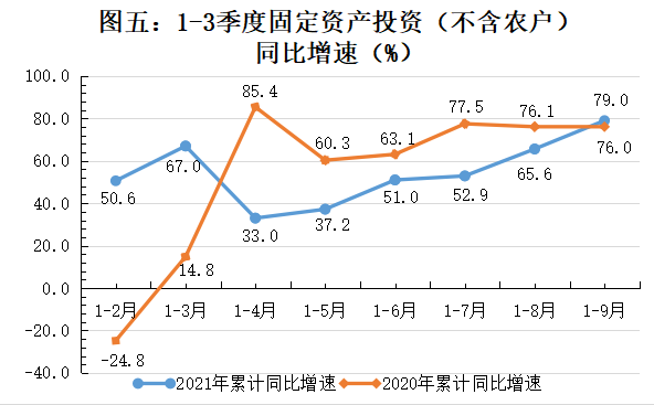 前三季度,固定资产投资增速创年内新高,同比增长79.0%,比上半年增速提高28个百分点,比去年同期提高个3百分点。两年平均增长77.5%,比上半年两年平均增速提高20.6个百分点。