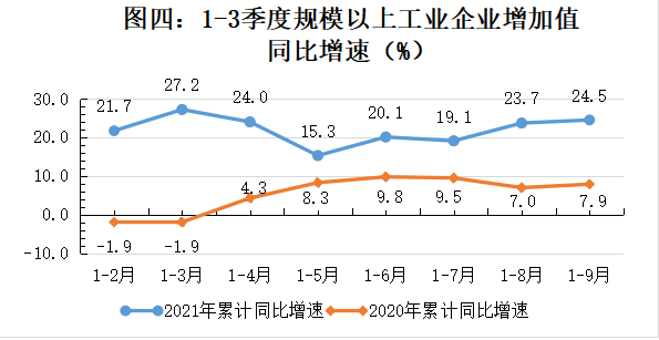 前三季度,规模以上工业增加值累计同比增长24.5%,比上半年增速提高4.4个百分点;两年平均增长15.9%,比上半年两年平均增速提高1.1个百分点。