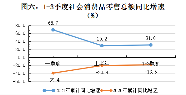 前三季度,州直实现全社会消费品零售总额207.99亿元,同比增长31.0%,比上半年增速提高1.8个百分点,两年平均增长3.3%,比上半年两年平均增速提高1.9个百分点。其中,限额以上社会消费零售额79.82亿元,同比增长46.9%,两年平均增长14.6%。