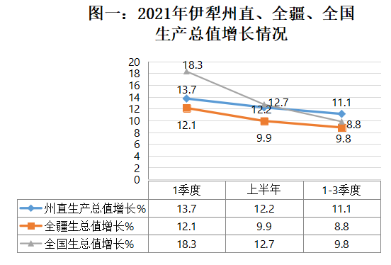 根据自治区地区生产总值统一核算结果,前三季度州直实现地区生产总值1060.41亿元,按可比价格计算,同比增长11.1%,两年平均增长7.0%。从季度看,一季度生产总值增长13.7%,上半年增长12.2%,1-3季度增长11.1%,持续保持两位数增长。一季度、上半年、1-3季度增速分别高于全疆(12.1%、9.9%、8.8%)1.6个、2.3个、2.3个百分点,增长态势持续巩固。
