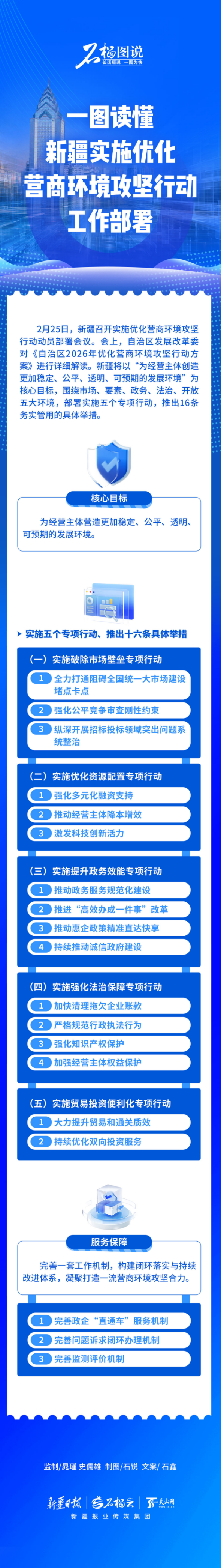 2月25日,新疆召开实施优化营商环境攻坚行动动员部署会议。会上,自治区发展改革委对《自治区2026年优化营商环境攻坚行动方案》进行详细解读。新疆将以“为经营主体创造更加稳定、公平、透明、可预期的发展环境”为核心目标,围绕市场、要素、政务、法治、开放五大环境,部署实施五个专项行动,推出16条务实管用的具体举措。