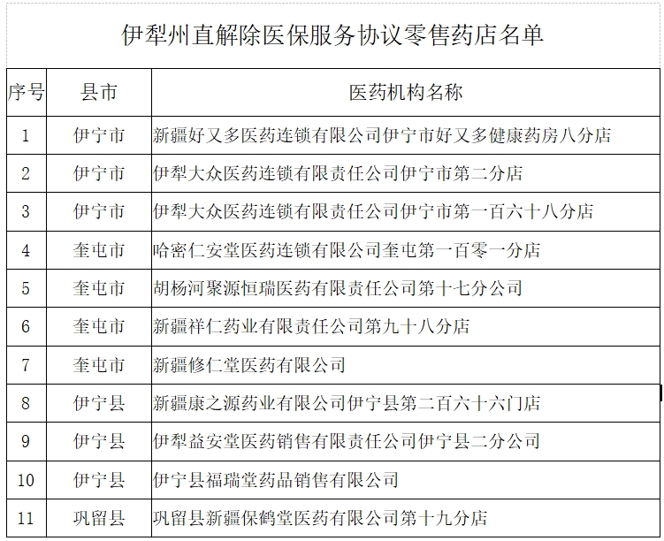 为进一步加强定点医药机构管理,维护医保基金安全运行,按照《零售药店医疗保障定点管理暂行办法》(国家医疗保障局令第3号)有关规定及医保服务协议约定内容,解除11家定点零售药店医保服务协议,现将有关名单予以公布。