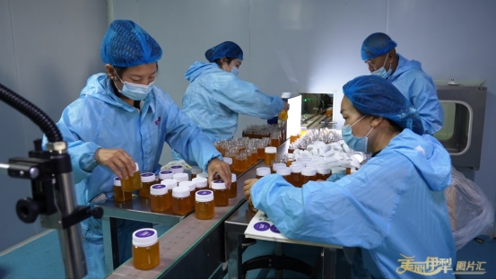 图为伊犁伊阳蜂业有限公司的蜂蜜罐装车间。
