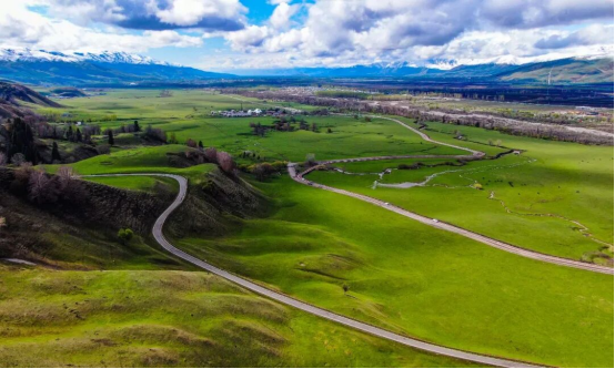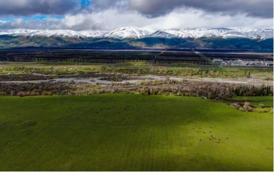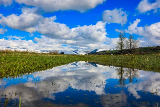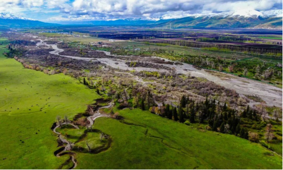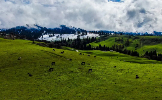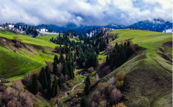 此时的那拉提,冰雪消融、万物复苏,鲜活绿意与凛冽冰雪碰撞,绘就层次丰富的春日草原画卷。