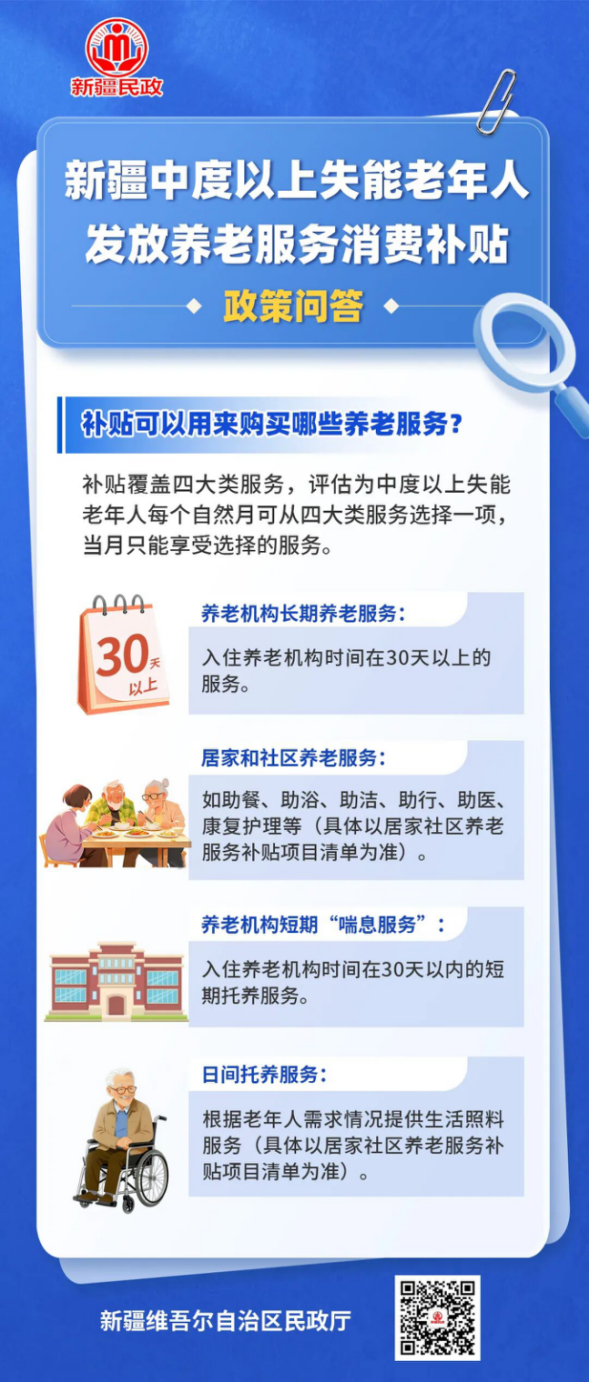 2026年1月1日起,新疆在全区范围内首次面向中度以上失能老年人发放养老服务消费补贴。即日起,新疆民政将通过六期系列海报,为您系统解读中度以上失能老年人养老服务消费补贴政策。