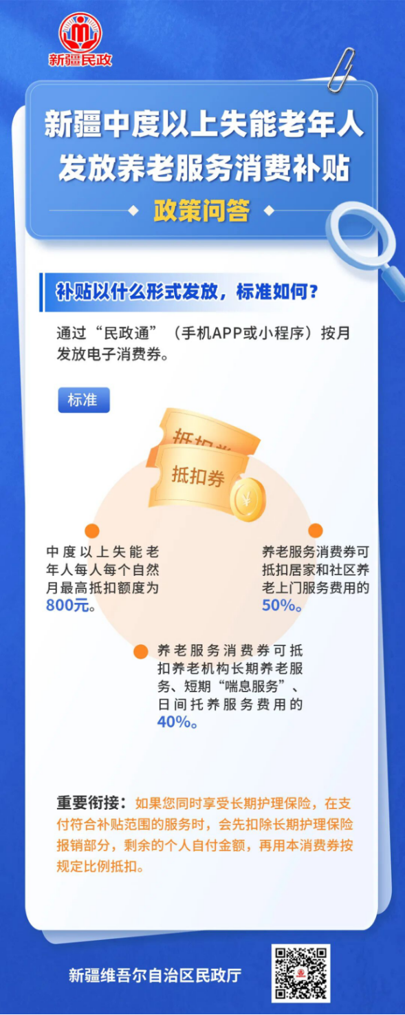 2026年1月1日起,新疆在全区范围内首次面向中度以上失能老年人发放养老服务消费补贴。即日起,新疆民政将通过六期系列海报,为您系统解读中度以上失能老年人养老服务消费补贴政策。