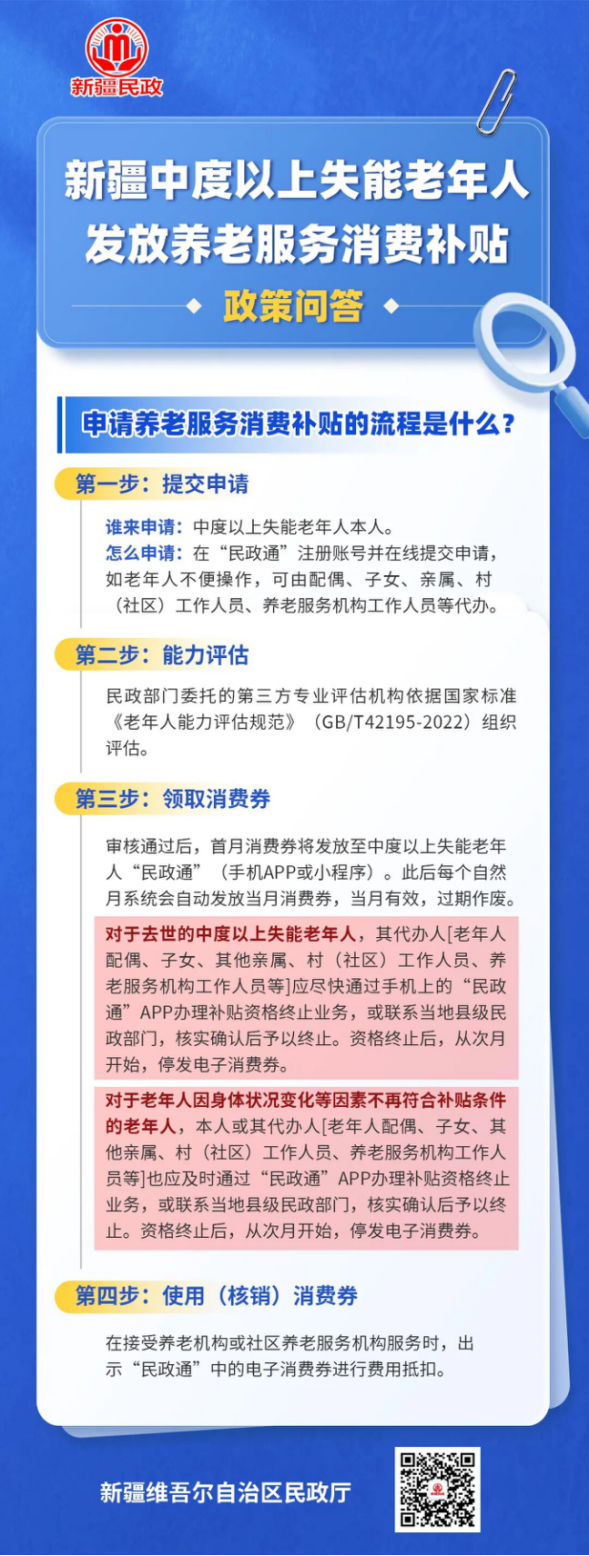 2026年1月1日起,新疆在全区范围内首次面向中度以上失能老年人发放养老服务消费补贴。即日起,新疆民政将通过六期系列海报,为您系统解读中度以上失能老年人养老服务消费补贴政策。