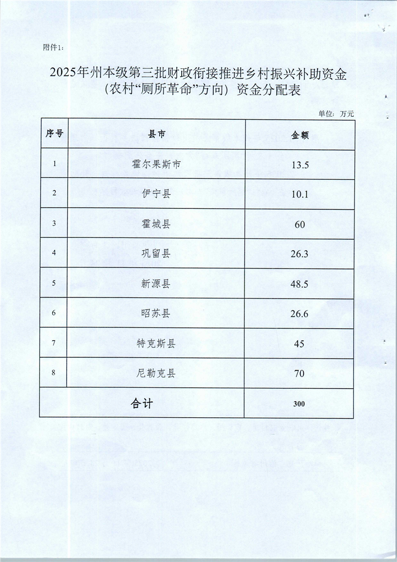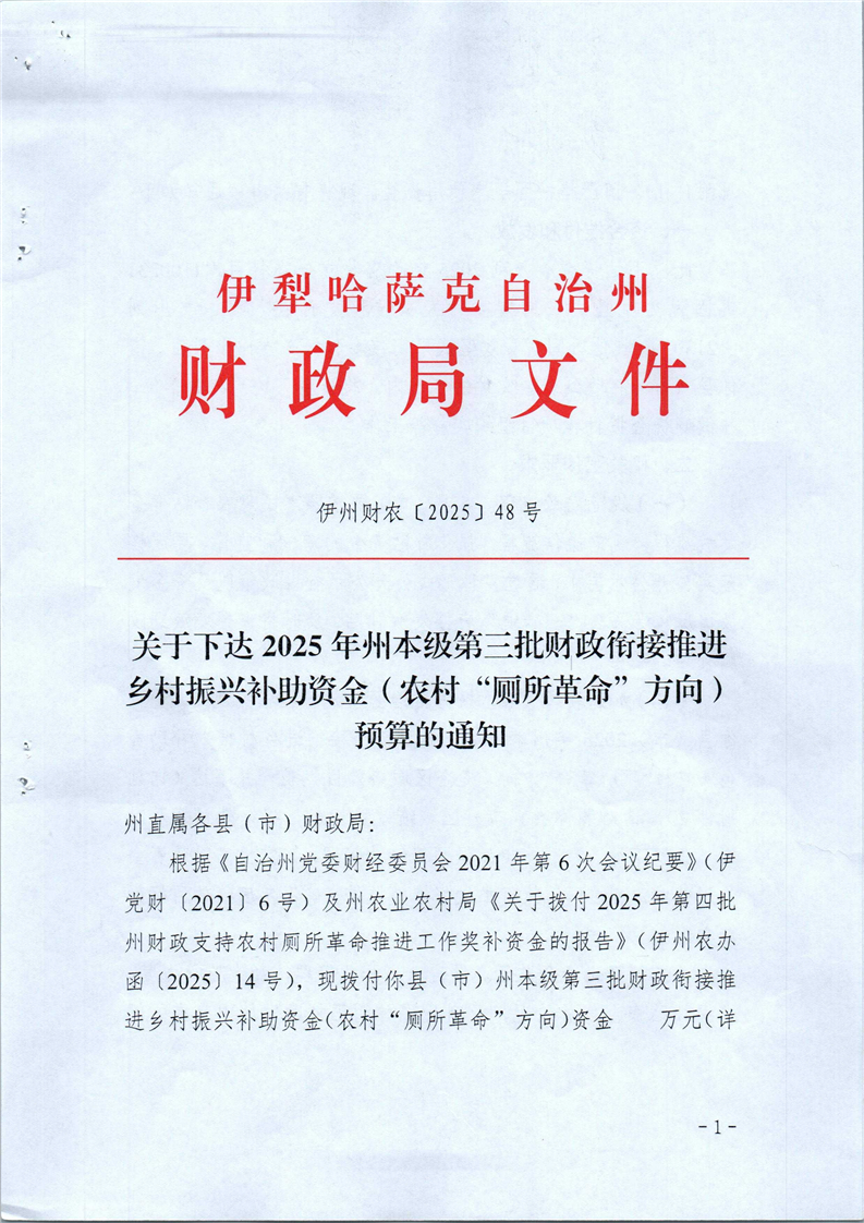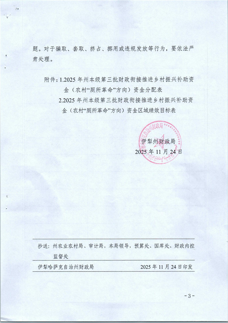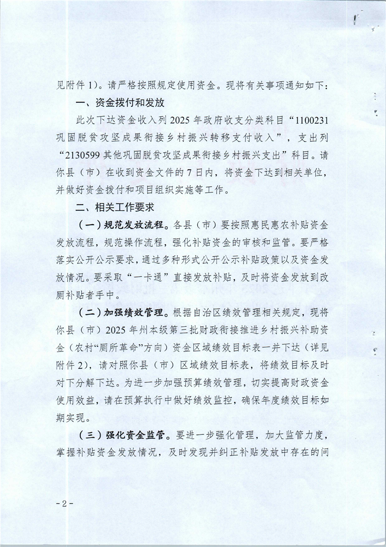 关于下达2025年州本级第三批财政衔接推进乡村振兴补助资金(农村“厕所革命”方向)预算的通知