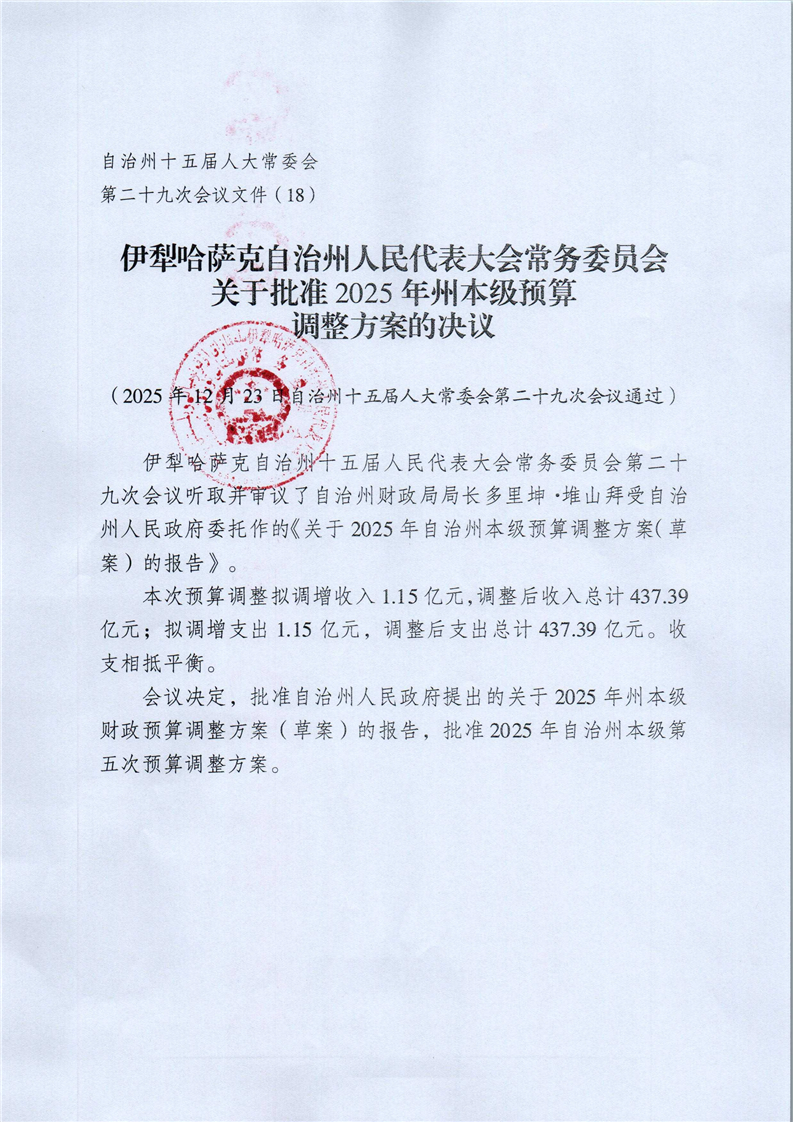 伊犁哈萨克自治州人民代表大会常务委员会关于批准2025年州本级财政预算调整方案的决议